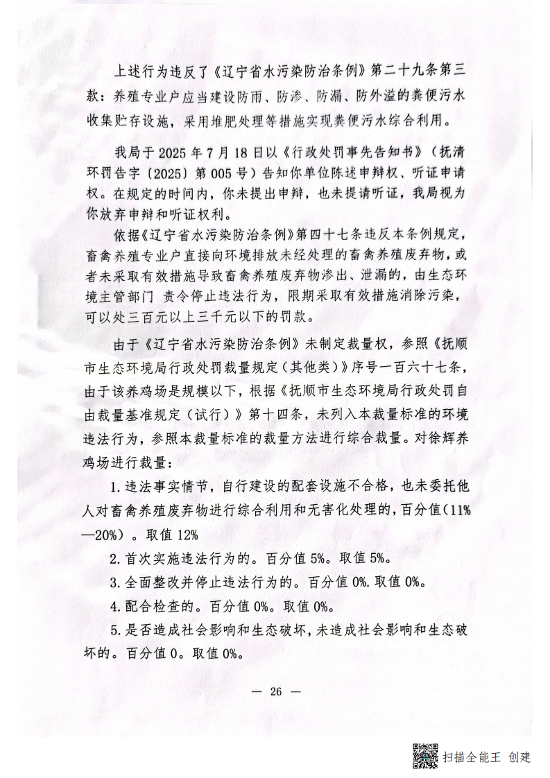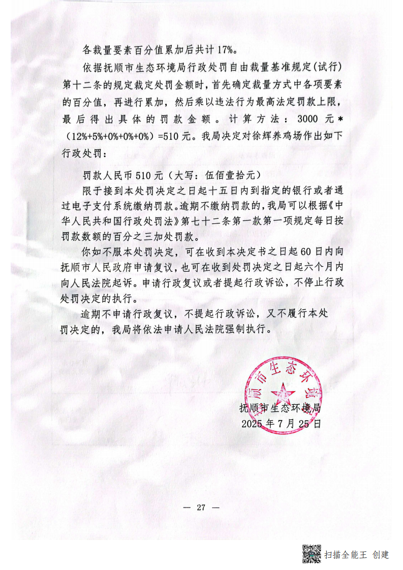 抚顺市生态环境局行政处罚决定书
